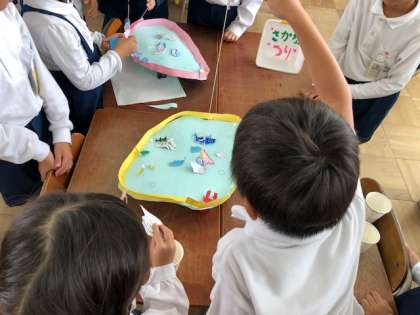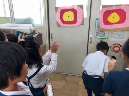2時間目に、1年生が教室に来て、これまで生活科の時間に作ってきた手作りおもちゃで遊びました。2年生はお店当番をして、1年生にルールを説明したり、楽しく遊べるコツを伝えたりしてがんばっていました。1年生も楽しく遊んでくれていたようで、2年生も嬉しそうでした。