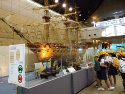 神戸海洋博物館に入りました。 まずは大きな帆船の模型が出迎えてくれました。