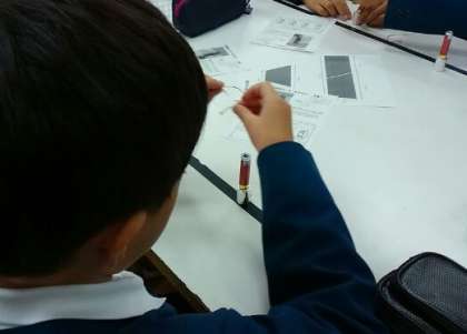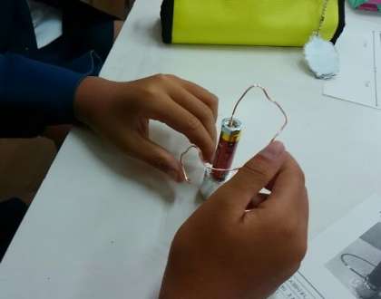 磁石、アルミホイル、導線、乾電池、ナットを使って簡単なモーターを作る実験をしました。児童は、うまく回転させようと試行錯誤しながら取り組んでいました。