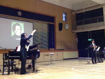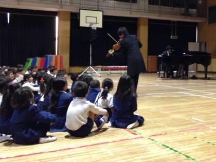 今年の芸術鑑賞会は、クラシックデュオ「スギテツ」(ピアノ・杉浦 哲郎さん、ヴァイオリン・岡田 鉄平さん)のコンサートです。NHKのEテレ「音楽ブラボー」にレギュラー出演されているので、子ども達もお二人をよく知っています。