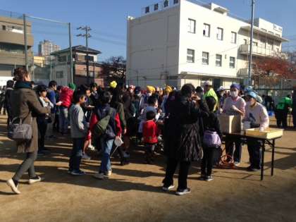 12月とは思えない暖かな日差しの下、たくさんの子ども達が参加しました。用意された80kg、40臼のもちは、あっという間になくなりました。