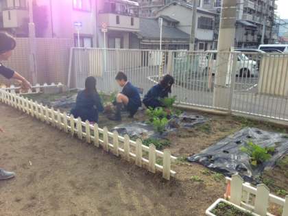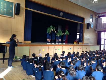 大きく育ったので、みんなに見てもらうことにしました。まるで桜島大根のようにまるまると太った大根です。ふだん、葉っぱを切り落としてカットした大根しか見たことがないので、子ども達はびっくりしていました。