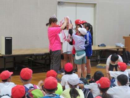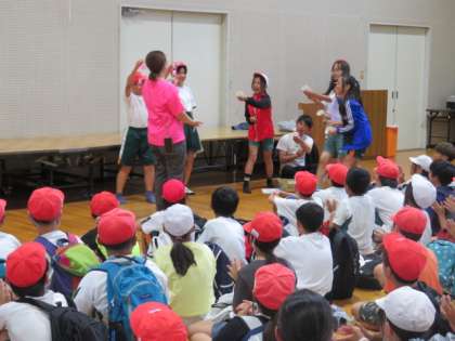 日差しが照り付けているので、草原遊びの予定を体育館遊びに変更しました。