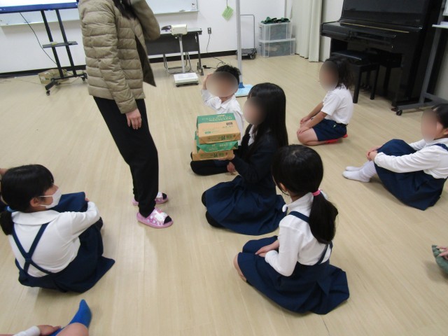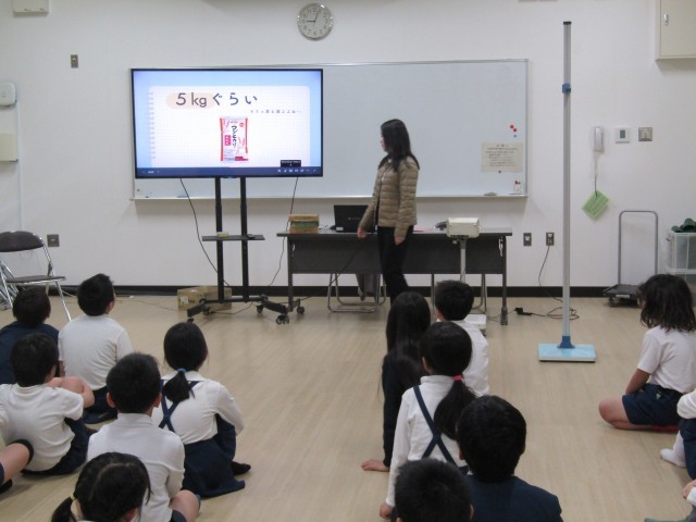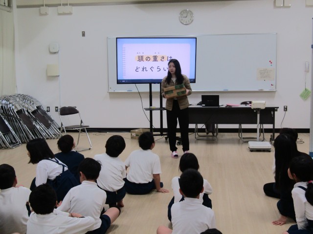 あわせて保健指導では、「正しい姿勢」について学びました。子どもたちはまず、人の頭の重さが約5キログラムもあることを知り、実際に同じくらいの重さのものを持ってみました。「思ったより重い!」と驚く声があがりました。