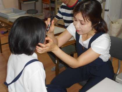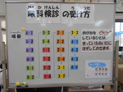 5月16日(木)に全学年の眼科検診を行いました。約800人の児童の目の状態を眼科の校医鹿野先生に午前中いっぱいかけて、診ていただきました。「目が赤くなっているけれど、かゆくないですか」と気になる症状の子どもにやさしく声をかけながら、診ていただきました。