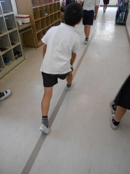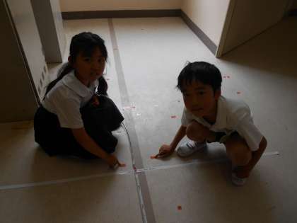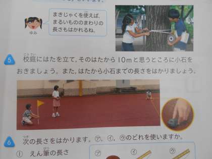 3年生が、長さの学習で、「10メートルと思うところにしるしをつけよう」という課題に取り組んでいました。ろうかに出て、「10メートルは、しるしの所から、どれくらいのきょりかな?」と考えながら、取り組んでいました。