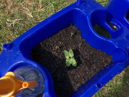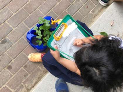 1年生が、5月末に植えたあさがおの観察をしていました。