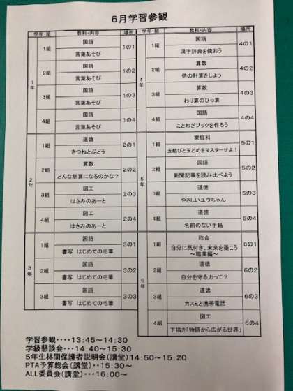 学習参観・学級懇談会・林間説明会・PTA総会
