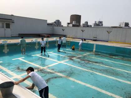21日(金)のプール開きに向けて、教職員でプール清掃を行いました。