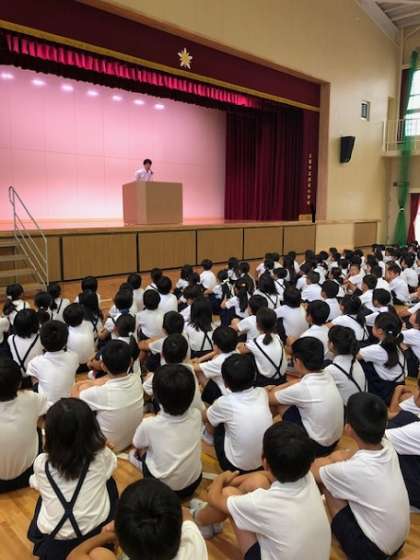 校長先生に続いて、生活指導の先生から「夏休みのくらし」についてお話がありました。「夏休みには、6つの事件や事故が多い。」と教えてもらいました。