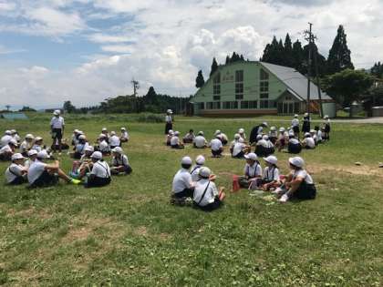 5年生の子どもたちは、広い高原でお弁当を食べ、これから魚つかみです!