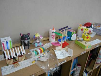 貯金箱がたくさん並んでいましたが、理科の実験に取り組んだ人や、家庭科の学習を生かして、かばん作りに挑戦した人もいました。