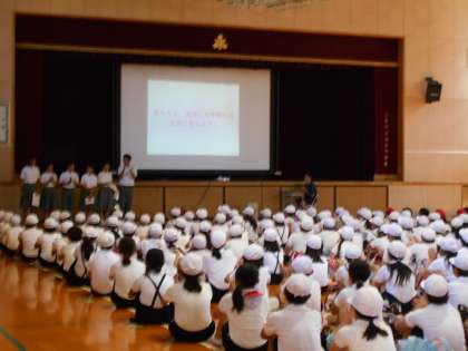 聖賢小学校、榎並小学校、成育小学校の6年生が講堂へ集合し、生徒会のみなさんが、「中学校生活」について説明をしてくれました。