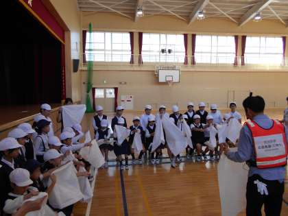 地域ごとに集合した後に、学校に避難をするという想定を実施しました。すでに登校していた子どもたちと運動場に整列し、「地域自主防災訓練」がスタートしました。