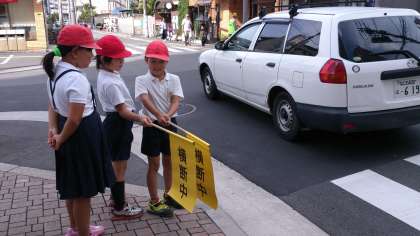 「交通事故の少ない街 城東区」を目指して、学校付近の交差点で交通マナーを呼びかける活動を行いました。区役所で交通安全の旗を借り、見守り隊のみなさんと一緒に「信号をまもろう」「交通マナーを守ろう」と呼びかけました。