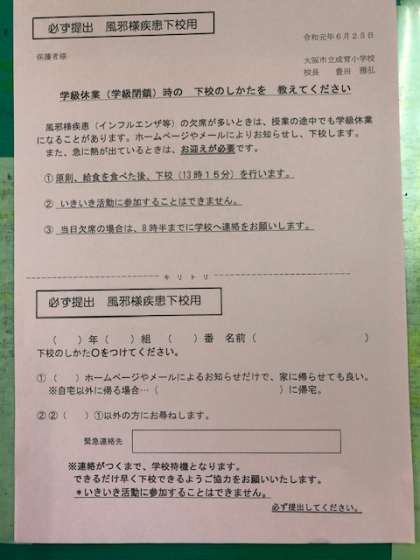 本校でも、発熱で欠席する児童が増えてきています。そこで、1学期にご提出いただいた手紙で再度ご確認いただきたきたいことを記載します。