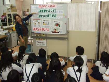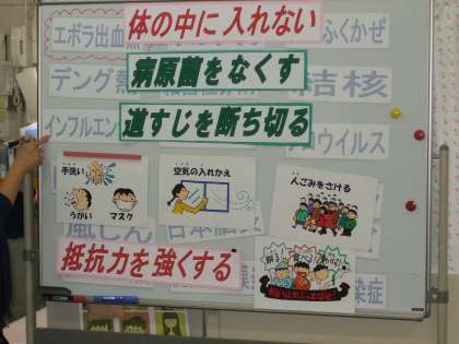 養護教諭による保健指導が行われました。「感染症の予防」の学習です。
