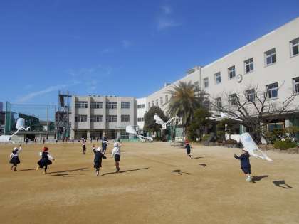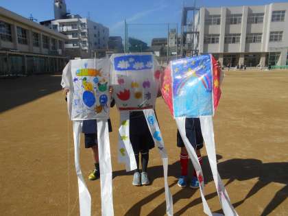 1年生が生活科の学習でつくった凧を運動場であげました。凧を持つ人と走る人を友だちと順番交代しながら、凧をあげました。うまく凧があがり、とてもうれしそうでした。友だちと糸がもつれないように距離をあけて走っていました。