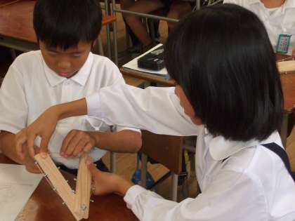 授業の導入の「かさ袋につけた手」から始まり、レントゲン写真、ストローで作った腕の骨の模型、板切れとボルトで作った関節と筋肉の関係を調べる模型など、毎時間、教室に持ち込まれる手作り教材に、子どもたちは目を輝かせていました。