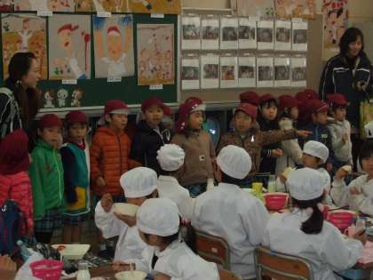 給食時間には、1年生のお兄さん・お姉さんのクラスを見学しました。
