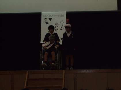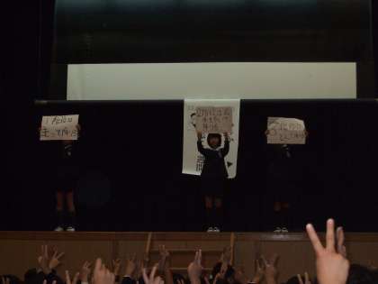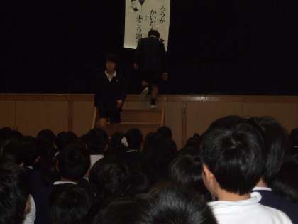 児童朝会では、代表委員会の子どもたちが、寸劇をまじえたクイズをして、
