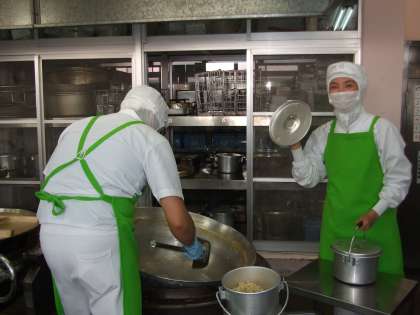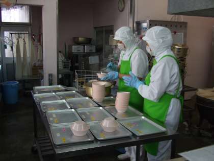 大きなお鍋の「卵とじ」は食缶に分けられて、教室に運ばれます。