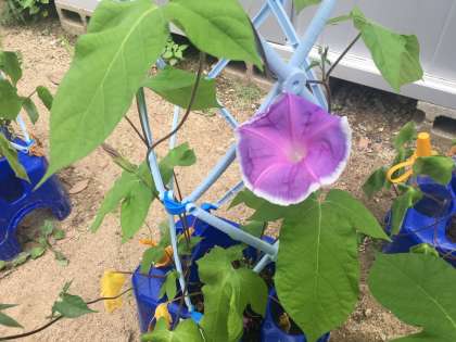 生活科の学習で大切に育ててきたアサガオですが、つるも長く伸びて少しずつ花が咲きはじめました。このアサガオは、夏休み中にもご家庭で観察してもらうため、個人懇談会の日に保護者の方にアサガオの植木鉢を持ち帰っていただきたいと思います。植木鉢を入れる大きめの袋(汚れてもよいもの)をご持参ください。