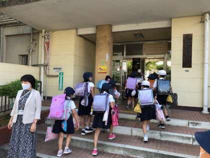 マスクをしながら、残暑を乗り越えなければなりません。いつもより多めの水分を持たせていただくとともに、「早寝・早起き・朝ごはん」をご家庭でも気にかけていただき、規則正しい生活が過ごせるようにご協力をよろしくお願いします。
