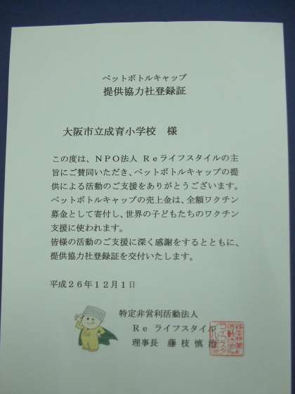 10月に全校で1週間集めたペットボトルキャップ6000個のお礼が