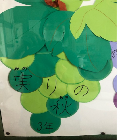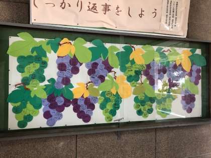 9月になりました。今月の玄関掲示は、3年生の「実りの秋」。3年生の2学期の目標が書かれています。「漢字をていねいに書きます。」「1日1回は、発表をがんばります。」「やると決めたことは、最後まできっちりする。」など、自分の「なりたい」がきちんと書かれていて、すばらしかったです。