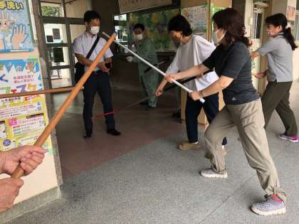 今日、9月18日(金)不審者訓練を実施しました。不審者の侵入の連絡を受け、教職員が玄関で犯人役を校内に入れないように防御しました。同時に、警察に連絡する犯人役の特徴を電話連絡する訓練をしました。