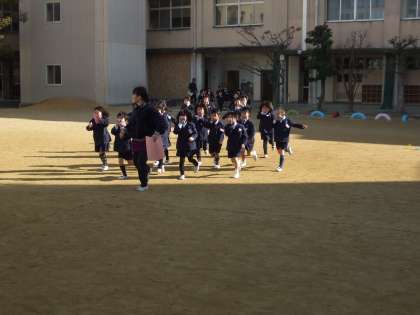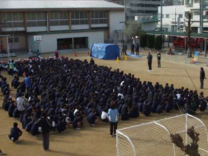 教室では、地震発生時には机の下に避難します。そのあと、校舎から出火