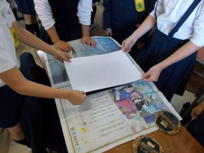 4年生は図画工作科で、板に自画像を写し、それをもとに彫刻刀を使って彫る活動をしてきました。苦労して掘りあげた板にインクをつけて版画紙に写すと、「きれい!」「すごい!」と、楽しそうに活動をしていました。
