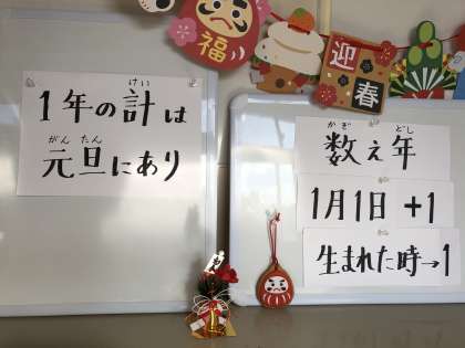 校長先生からは、「1年の計は元旦にあり。がんばりたい目標を決めて、学級の友だちと発表しあえるとといいですね。」と、お話がありました。また、「数え年」のお話もあり、生まれた時を1歳と数え、1月1日が来ると、1歳年を取る。というお話に、低学年の子どもたちは驚いた様子でした。