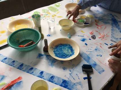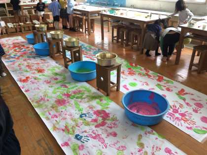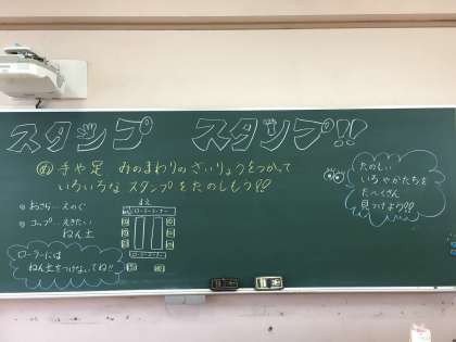 1年生の図画工作科では、絵の具や液体粘土を使ってスタンプ遊びをしました。ローラーやスポンジだけでなく、自分の手や足を使って自由に描くことができることに子どもたちはすごく楽しそうでした。残り少ない3学期ですが、良い思い出ができました。