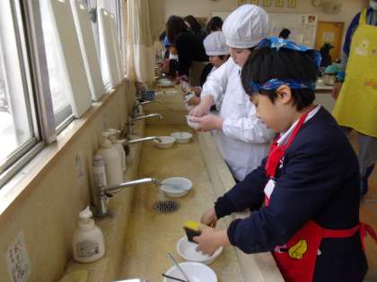 「手をせいけつに」を第一にいつもよりも念入りに手洗いをし、いよいよ調理スタート!
