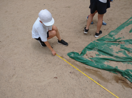 「次は鉄棒を測ろう!」「運動場の端から端までは何メートルだろう?」と子どもたちは興味をもって調べていました。