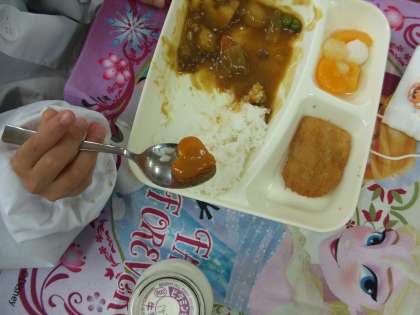 今日の給食は子どもたちの大好きなメニュー、「カツカレーライス」でした。