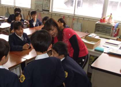 写真は4年3組の活動の様子。1年生が王様になって「王様じゃんけん」をしたり、1年生に「好きな色」をインタビューしたりしているところです。