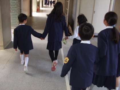 しっかりと手をつないで集会場所へ連れて行っていました。