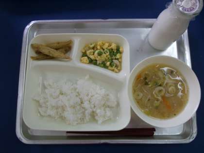 きびなごてんぷら・みそ汁・えんどうの卵とじ・ごはん・牛乳でした。