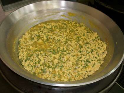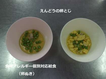 「えんどうの卵とじ」は卵の食物アレルギー個別対応給食です。卵を除去したものの区別がつくように、給食室でピンク色の食器に配食され、担任の先生が教室まで運んでいます。これで卵アレルギーを持つ児童も安心して「いただきまーす!」