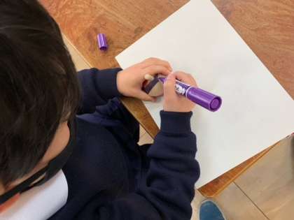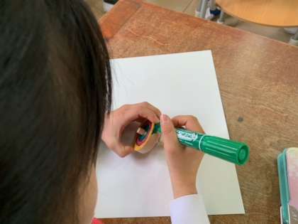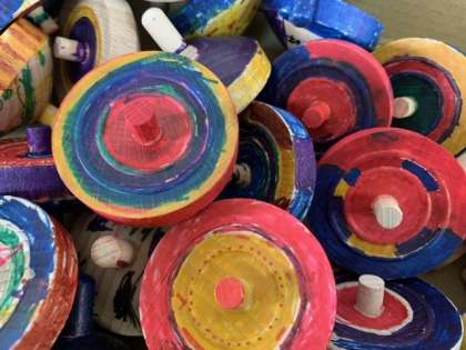 生活科の学習では、こまづくりをしました。工夫して、自分だけの素敵なこまをつくっていました。こまを初めて見た子どもたちもいて、遊ぶのをすごく楽しみにしていました。