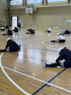 とても寒く冷え込む講堂ですが、子どもたちはとても元気です!寒いからこそ、しっかり準備体操。そして、全校で取り組んでいる柔軟運動もしっかり行います。