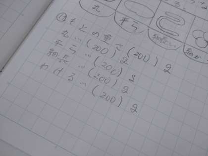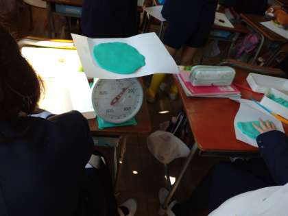 初めに粘土を決まった重さになるように計り、それを丸い形や平たい形に変えて再度重さを計りました。