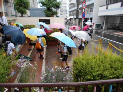 子どもたちは雨の中、登校でした。玄関付近は色とりどりの傘でいっぱいでした。