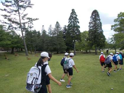 本日、校外学習で奈良公園に行きました。はじめての大仏にびっくり!「でっかいなあ!」「指の形が面白い!」と話しながら見学していました。