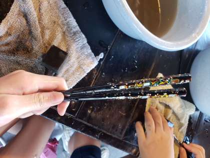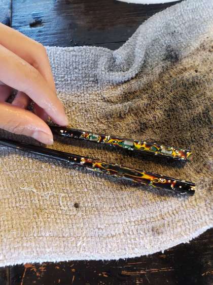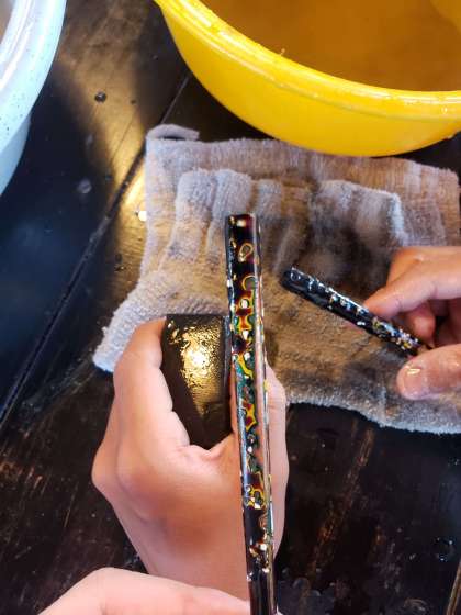 箸作りでは、若狭塗箸というお箸を、砥石で削っていきました。黒色のお箸が削っていくと、赤色や黄色、緑色などが出てきて、それぞれ素敵な模様や色合いのお箸を作ることができました。