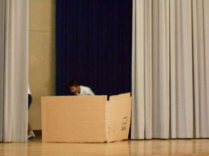 講堂の舞台の上に大きな段ボールを立て、その後ろに何人の友達が