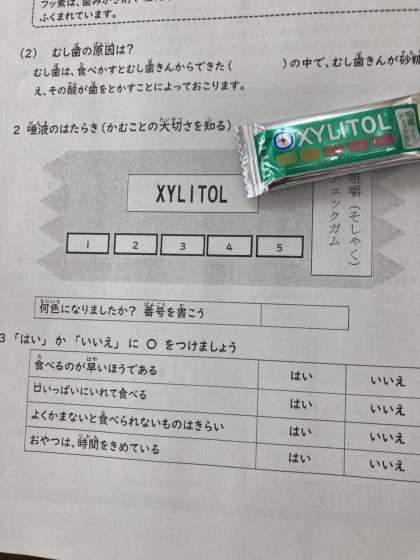 その後、咀嚼がどれくらいできているかを、しっかり噛めば噛むほど色の変わるガムで確認してみたり、フッ化物塗布を行ったりしました。